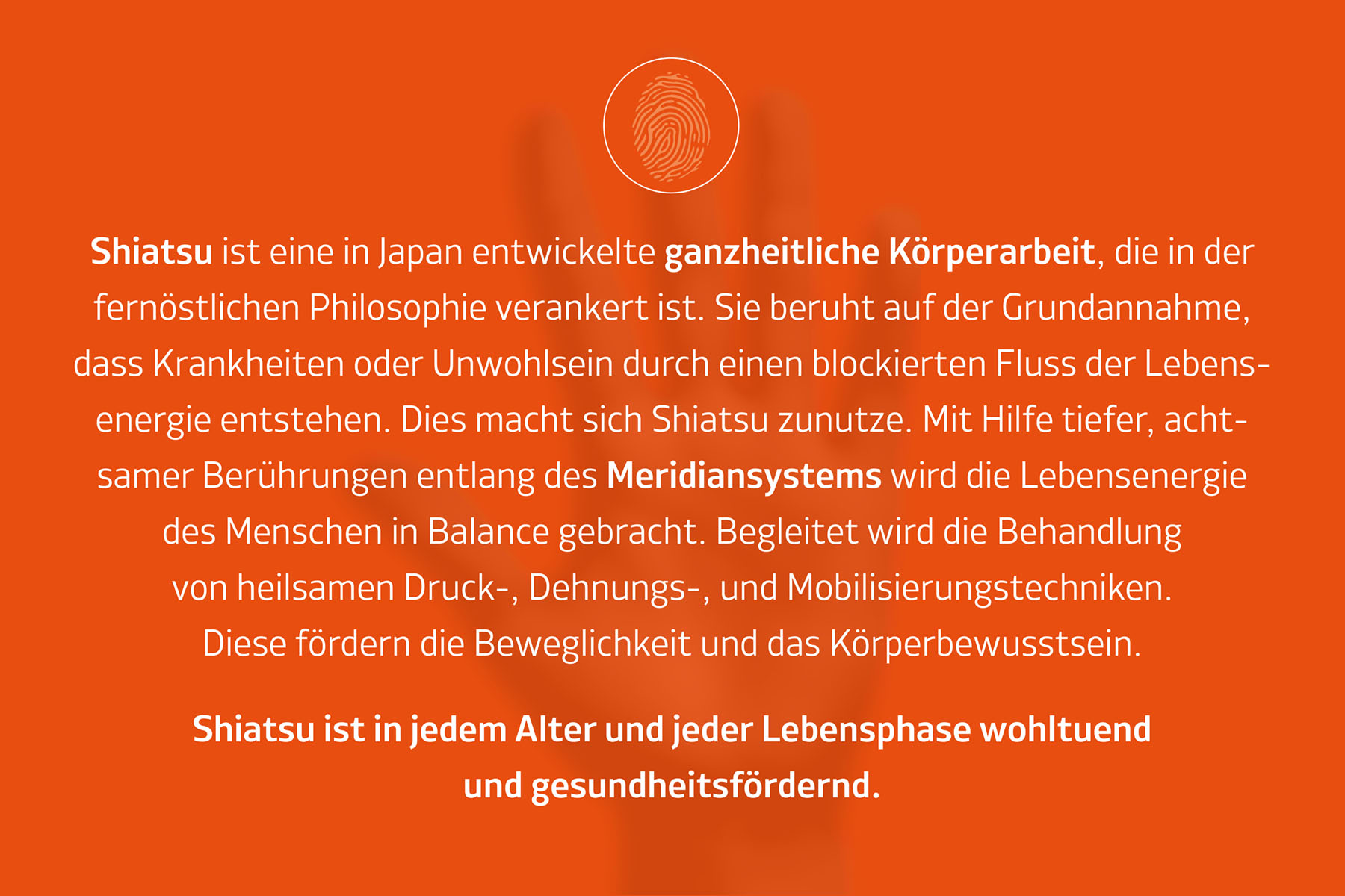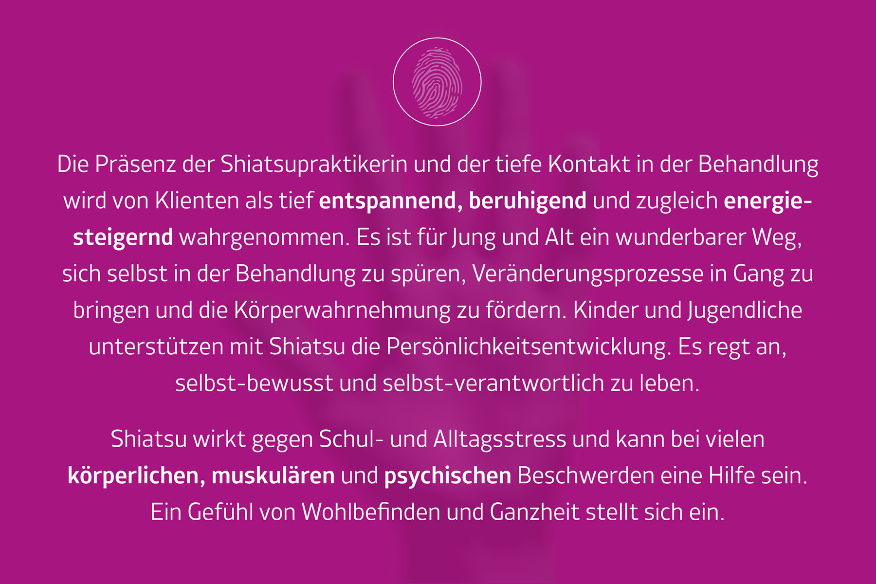 Shiatsu heisst wörtlich „Fingerdruck” und ist eine japanische, ganzheitliche Behandlungsmethode am bekleideten Körper.